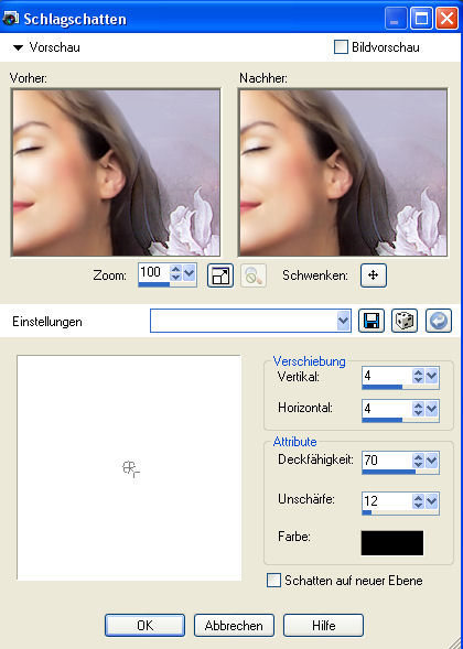Macht die beiden oberen Ebenen unsichtbar. 17. Dupliziert die unterste Ebene einmal. Auf der duplizierten Ebene Bild - Größe ändern - 85 % (Größe aller Ebenen angepasst nicht angehakt) und folgenden Schlagschatten anwenden: