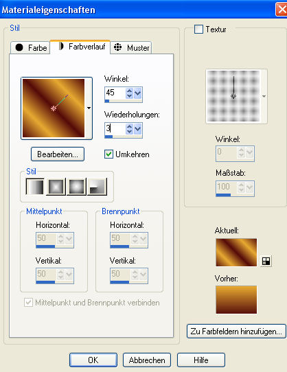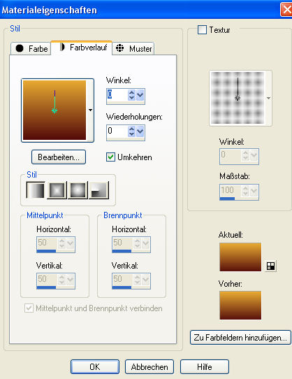 Dieses Tutorial habe ich selbst entworfen und es unterliegt meinem Copyright. Das Material stammt aus Tauschgruppen und das Copyright liegt beim jeweiligen Künstler. Ich habe das Tutorial mit Paint Shop Pro X2 geschrieben, es läßt sich aber mit allen anderen Versionen problemlos nachbasteln. Du benötigst: Paint Shop Pro Tuben: 1 Hintergrundfraktalbild 1 Futuretube 1 Treppen- oder Brückentube Mein Material kannst Du Dir hier herunterladen. Filter: Graphics Plus - Cross Shadow Muras Seamless - Emboss at Alpha Hast Du alles zusammen? Dann laß uns beginnen! 1. Öffne Dir ein neues transparentes Arbeitsblatt in 700 x 600 Pixeln Größe. 2. Such Dir aus Deinen Tuben eine helle Vordergrundfarbe (meine ist #e7a932) und eine dunkle Hintergrundfarbe (meine ist #530b0a). Erstelle Dir aus diesen Farben einen schönen Farbverlauf. Ich habe diesen gewählt: