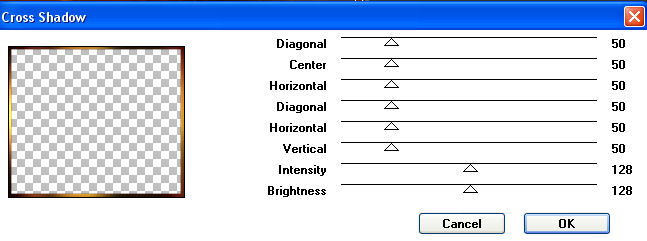Legt eine neue Rasterebene an und geht auf Auswahl - Alles auswählen. 7. Füllt Eure Auswahl mit dem eben erstellten Farbverlauf und geht auf Auswahl - Ändern - Verkleinern - um 8 Pixel. Drückt einmal die Entf-Taste auf Eurer Tastatur. 8. Auswahl - Umkehren und wendet den Filter Graphics Plus - Cross Shadow mit diesen Einstellungen an: