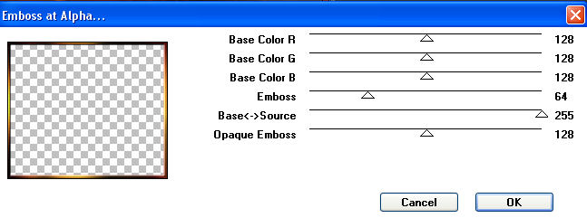 Lasst die Auswahl bestehen. 9. Wendet den Filter Muras Seamless - Emboss at Alpha mit diesen Einstellungen an: