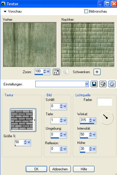 Dieses Tutorial habe ich selbst entworfen und es unterliegt meinem Copyright. Das Material stammt aus Tauschgruppen und das Copyright liegt beim jeweiligen Künstler. Ich habe das Tutorial mit Paint Shop Pro X2 geschrieben, es läßt sich aber mit allen anderen PSP-Versionen problemlos nachbasteln. Du benötigst: Paint Shop Pro Animationsshop Tuben: 1 Frauentube 2 Häusertuben 1 Koffertube 1 Schuhtube evtl. Deco Mein Material kannst Du Dir hier herunterladen. Filter: werden diesmal nicht benötigt, wir benutzen einen Effekt, der im Anishop vorhanden ist. Hast Du alles zusammen? Dann lass uns beginnen. 1. Öffne Dir ein neues transparentes Arbeitsblatt in 600 x 500 Pixeln Größe. 2. Such Dir aus Deinen Tuben eine helle Vordergrundfarbe (meine ist #6a6347) und eine dunklere Hintergrundfarbe (meine ist #3e3728). 3. Auswahl - Alles auswählen und kopiere den Hintergrund " Roxstock_Texture_Background_14_by_RoxStock.jpg" oder Deine eigene Textur. Füge sie in eine Auswahl ein. Hebe die Auswahl auf. 4. Effekte - Textureffekte - Textur und wähle die Textur Ziegel mit diesen Einstellungen: