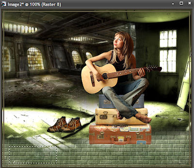5. Kopiere das Tube "ametista_once_it_was_a_ballroom_020906.pspimage" oder Dein eigenes Häusertube und füge es als neue Ebene auf Deinem Bild ein. Wenn Du das beigelegte Tube verwendest, dann zieh es mit dem Objektauswahlwerkzeug (Rasterverformungswerkzeug) ein wenig nach oben.. Verschiebe das Tube an den rechten Rand. Dupliziere das Tube und spiegele die duplizierte Ebene einmal und schiebe sie nach links an den Rand. 6. Kopiere das Tube "mds5977 Room.pspimage" oder Dein zweites Häusertube und füge es auf Deinem Bild als neue Ebene ein. Wenn Du das beigelegte Tube verwendest, dann spiegel es einmal vertikal. Verschiebe das Tube nun nach links an den Rand und schau, dass es mit dem anderen Haustube gut zusammen passt. Evtl. mußt Du auch ein wenig radieren. 7. Kopiere das Tube " 1034_object_5_ABR_820_Alejandra_Rosales_23_10_06.psp" oder Deine eigene Koffertube und füge sie als neue Ebene auf Deinem Bild ein. Wenn Du die beigelegte Tube verwendest, dann verkleinere sie auf 40% (Größe aller Ebenen anpassen nicht angehakt). Verschiebe sie an einen Platz der Dir gefällt. 8. Kopiere das Tube "chica_y_guitarra_por_barullo.psp" oder Deine eigene Frauentube. Wenn Du die beigelegte verwendest, dann mußt Du die Größe auf 60% ändern (Größe aller Ebenen anpassen nicht angehakt). Platziere sie auf die Koffer. 9. Kopiere das Tube "Mtm_Misc 167-Schoenen-5 Mei 2007.pspimage" oder Deine eigene Schuhtube und füge sie als neue Ebene auf Deinem Bild ein. Wenn Du die begelegte Tube verwendest mußt die sie auf 20% verkleinern (Größe aller Ebenen anpassen nicht angehakt). 10. Lege Dir nun eine neue Rasterebene an und gehe auf Auswahl - Alles auswählen. Fülle die Auswahl mit Deiner Hintergrundfarbe. Auswahl - Ändern - Verkleinern - um 3 Pixel und drücke einmal die Entf-Taste auf Deiner Tastatur. Auswahl - Ändern - Verkleinern - um 3 Pixel und fülle mit Deiner Vordergrundfarbe. Auswahl - Ändern - Verkleinern - um 3 Pixel und drücke wieder die Entf-Taste auf Deiner Tastatur. Hebe die Auswahl auf. 11. Setze an dieser Stelle Dein Wasserzeichen oder Deinen Namenszug auf Dein Bild, aber noch nicht den Titel Deines Bildes. Ebenen - Einbinden - Sichtbare zusammenfassen. Lege eine neue Rasterebene an und ziehe nun mit Deinem Auswahlwerkzeug eine rechteckige Auswahl auf Deinem Bild auf. So sieht das bei mir aus: