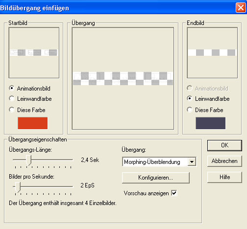 13. Setze nun Deine Schrift in die 3 Auswahlkästchen und gehe 3 mal auf Ebenen - Einbinden - Nach unten zusammenfassen. Jetzt hast Du zwei Ebenen - die untere ist Deine zusammengefasste Ebene und die obere sind die 3 Auswahlkästchen mit Deinem Schriftzug. 14. Aktiviere Deine untere Ebene und gehe auf Bearbeiten - Kopieren. Öffne den Anishop und gehe dort auf Bearbeiten - Einfügen - Als neue Animation. 15. Gehe zurück zu PSP und aktiviere die obere Ebene. Gehe wieder auf Bearbeiten - Kopieren. Wechsle in den Anishop und gehe hier auf Bearbeiten - Einfügen - Als neue Animation. 16. Gehe jetzt im Anishop auf Effekte - Bildübergang einfügen und wähle dort diese Einstellungen: