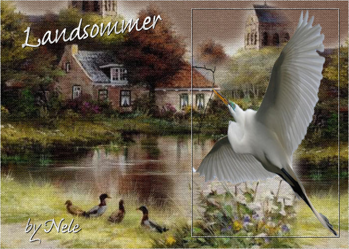 10. Lege eine neue Rasterebene an. Auswahl - Alles auswählen Fülle die Auswahl wieder mit Deinem Silbermuster. Auswahl - Ändern - Verkleinern - um 1 Pixel Drücke einmal die Entf-Taste auf Deiner Tastatur. Hebe die Auswahl auf. 11. Setze nun Deinen Schriftzug auf Dein Bild und vergiß auch Deinen Namenszug oder Wasserzeichen nicht. Fasse nun alle Ebenen zusammen und speichere Dein Bild als jpg-Datei ab. Fertig ist Dein Sommer auf dem Land! Ich hoffe es hat Dir wieder Spaß gemacht dieses Tutorial nachzuarbeiten und Du schaust bald wieder auf meiner Seite vorbei.