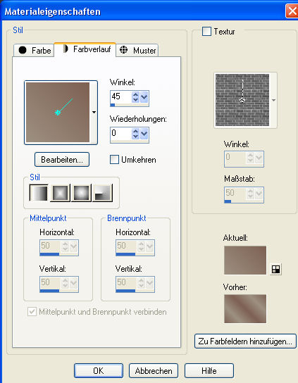 Dieses Tutorial habe ich selbst entworfen und es unterliegt meinem Copyright. Das Material stammt aus Tauschgruppen und das Copyright liegt beim jeweiligen Künstler. Ich habe dieses Tutorial mit Paint Shop Pro X2 geschrieben, es läßt sich aber mit allen anderen PSP-Versionen problemlos nacharbeiten. Du benötigst: Paint Shop Pro Tuben: 1 Landschaftstube 1 Vogel- oder Tiertube Mein Material kannst Du Dir hier herunterladen. Filter: Filters Unlimited 2.0 - Paper Textures - Canvas Fine Hast Du alles zusammen? Dann lass uns beginnen! 1. Öffne Dir ein neues transparentes Arbeitsblatt in 700 x 500 Pixeln Größe. 2. Suche Dir aus Deinen Tuben eine helle Vordergrundfarbe (meine ist #9d9080) und eine etwas dunklere Hintergrundfarbe (meine ist #7d6052) Erstelle Dir aus diesen Farben einen schönen Farbverlauf. Ich habe diesen gewählt: