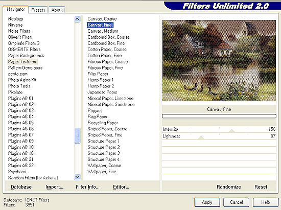 und fülle Dein Blatt damit. 3. Lege eine neue Rasterebene an. Auswahl - Alles auswählen. Kopiere das Tube "AH_Cottage_2207_08.pspimage" oder Dein eigenes Landschaftstube und füge es in eine Auswahl ein. Verschiebe das Tube nach rechts an den Rand. Hebe die Auswahl auf. 4. Dupliziere Dein Landschaftstube und gehe auf Bild - Vertikal spiegeln. Verschiebe das Tube nun nach links an den Rand passend zur unteren Landschaftsebene. Ziehe Dir nun mit dem Objektauswahlwerkzeug Deine beiden Ebenen noch passend in der Höhe zurecht. 5. Fasse nun Deine 3 Ebenen sichtbar zusammen und wende den Filter Filters Unlimited 2.0 - Paper Textures - Canvas Fine mit diesen Einstellungen an: