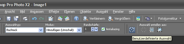 6.Lege Dir eine neue Rasterebene an. Gehe nun auf Dein Auswahlwerkzeug und dort auf benutzerdefinierte Auswahl: