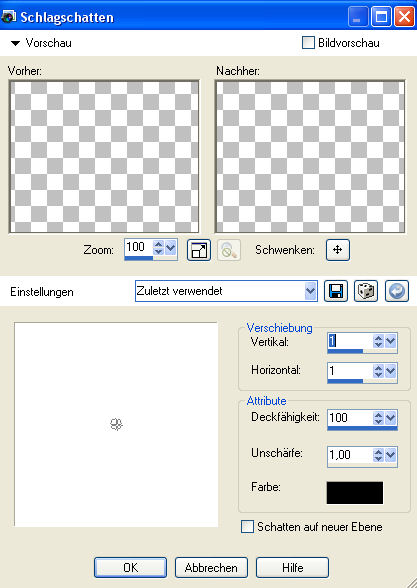 7. Kopiere das Tube "mou_birdie.pspimage" oder Dein eigenes Vogeltube und füge es in eine Auswahl ein. Halte die Auswahl noch. 8. Lege eine neue Rasterebene an. Fülle die Auswahl mit einem Silbermuster. Auswahl - Ändern - Verkleinern - um 1 Pixel und drücke nun einmal die Entf-Taste auf Deiner Tastatur. Hebe die Auswahl auf. 9. Effekte - 3D-Effekte - Schlagschatten mit diesen Werten: