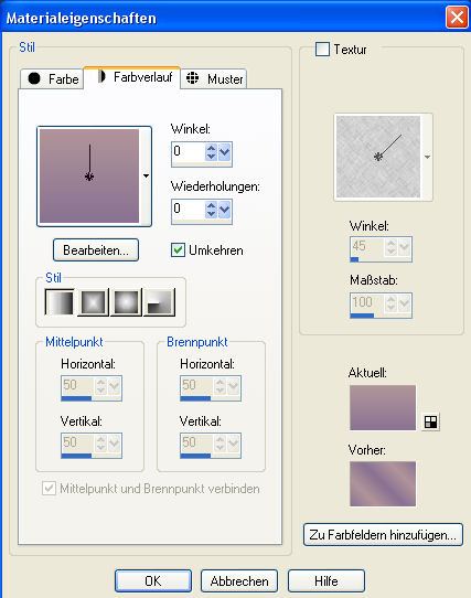 Dieses Tutorial habe ich selbst geschrieben und das Copyright liegt bei mir. Das Material stammt aus Tauschgruppen und das Copyright liegt beim entsprechenden Künstler. Ich habe es mit Paint Shop Pro X2 geschrieben, es läßt sich aber mit allen anderen Versionen problemlos nachbasteln. Du benötigst: Paint Shop Pro Animationsshop Tuben: 1 Frauentube 1 Flacontube 1 Blumentube 2 Auswahlen - meine sind von Herbert und ich habe die Erlaubnis sie zu benutzen - Danke Herbert! Mein Material kannst Du Dir hier herunterladen. Filter: Graphics Plus - Cross Shadow Filter Factory Gallery V - Auto Ellipse Filter Factory Gallery H - Raverberations Die beiden Auswahlen legst Du Dir in Deinen Auswahl-Ordner im PSP bevor Du PSP öffnest. Hast Du alles zusammen? Dann nimm Dir eine Tasse Kaffee und schon kann es losgehn. 1. Öffne Dir im PSP ein neues transparentes Arbeitsblatt in 650 x 550 Pixel Größe. 2. Such Dir aus Deinen Tuben eine hellere Vordergrundfarbe (meine ist #b19499) und eine dunklere Hintergrundfarbe (meine ist #887192) und erstelle Dir aus diesen Farben folgenden Farbverlauf: