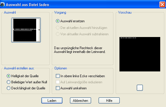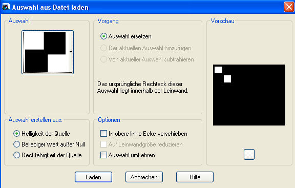 Das machst Du nun auch auf der Ebene Kästchen2 mit 15% und auf der Ebene Kästchen3 mit 20%. 17. Lege Dir eine neue Rasterebene an und gehe auf Auswahl - Auswahl laden/speichern - Auswahl aus Datei und suche Dir die Auswahl "auswahl10HF" und lade sie Dir mit diesen Einstellungen: