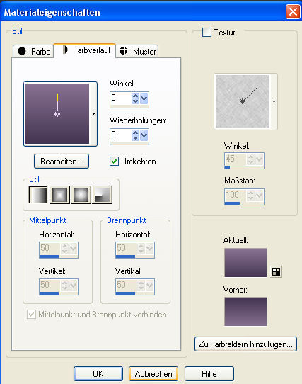 und fülle Dein Blatt damit. 3. Stelle Deine Vordergrundfarbe um auf #887192 und Deine Hintergrundfarbe auf #443452 also beides etwas dunklere Farben aus den Tuben. Bild - Rand hinzufügen - 5 Pixel in weiß und markiere diesen Rand mit dem Zauberstab. 4. Auf Deiner Vordergrundfarbe erstellst Du nun wieder diesen Farbverlauf: