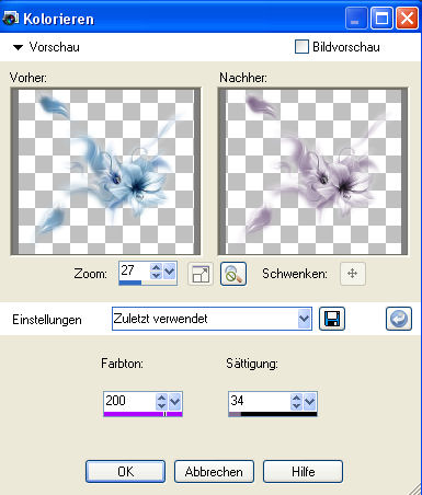 und noch einmal mit Minuswerten bei Vertikal und Horizontal. 8. Kopiere das Tube "jet-woman08-februari-2008.pspimage" oder Deine eigene Frauentube und füge sie als neue Ebene auf Deinem Bild ein. Wenn Du die beigelegte Tube verwendest mußt Du diese auf 80% verkleinern (Größe aller Ebenen angepasst nicht angehakt). Wenn Du eine eigene Tube verwendest mußt Du Dir die Größe selbst ausprobieren. Setze die Frau nach links unten an den äußeren Rand. Gebe der Frau noch den gleichen Schlagschatten wie in Schritt 7, allerdings nur mit den Pluswerten bei Vertikal und Horizontal. 9. Öffne nun das Tube "SKF_Flower117.07.pspimage" oder Deine eigene Blumentube. Wenn sie farblich nicht passt, dann koloriere sie so: Stelle Deine Vordergrundfarbe wieder ein und klicke in das Farbfeld hinein in der Materialpalette und notiere Dir den F-Wert und den S-Wert (F=Farbton, S=Sättigung). Schließe das Farbfeld wieder und aktiviere Deine Blumentube. Gehe nun auf Anpassen - Farbton und Sättigung - Kolorieren. Gib in dem kleinen Fenster was sich öffnet Deine Werte für F und S ein, die Du Dir eben markiert hast: