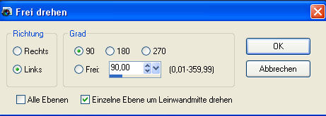 10. Kopiere nun Derin Blumentube und füge es als neue Ebene auf Deinem Bild ein. Schiebe sie ein wenig nach unten an den Rand und auch so weit es geht nach rechts an den Rand. Bei der beigelegten Blumentube stimmt die Größe so, wenn Du eine eigene verwendest mußt Du sie evtl. größenmäßig anpassen. Schiebe die Blumenebene nun in der Ebenenpalette unter die Ebene mit der Frau. 11. Gehe auf Deine oberste Ebene, kopiere das Tube "caro1042.pspimage" oder Deine eigene Flacontube und füge sie als neue Ebene auf Deinem Bild ein. Wenn Du die beigelegte Tube verwendest, dann verkleinere sie auf 50% (Größe aller Ebenen angepasst nicht angehakt). Schiebe sie nach rechts und unten an den inneren Rand. 12. Dupliziere Deine Flacontube und gehe nun auf Bild - Frei Drehen - Links - 90°: