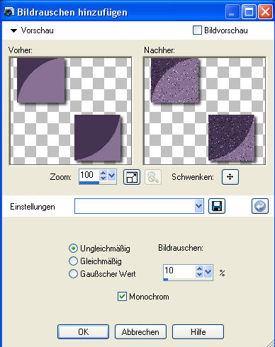 Hebe die Auswahl auf. 14. Verschiebe nun die beiden Kästchen nach rechts oben an den inneren Rand. Markiere die weißen Stellen der Kästchen mit Deinem Zauberstab und fülle oben und unten jeweils mit den entgegengesetzten Farben (beim oberen Kästchen also mit der Vordergrund- und beim unteren mit der Hintergrundfarbe). Hebe die Auswahl auf. Wende den Schlagschatten aus Punkt 7 nur mit den Pluswerten an. 15. Dupliziere nun die Kästchenebene 2 mal und benenne die drei Ebenen um in Kästchen1 Kästchen2 Kästchen3 16. Gehe auf die Ebene Kästchen1 und nun auf Anpassen - Bildrauschen hinzufügen/entfernen - Bildrauschen hinzufügen mit diesen Einstellungen: