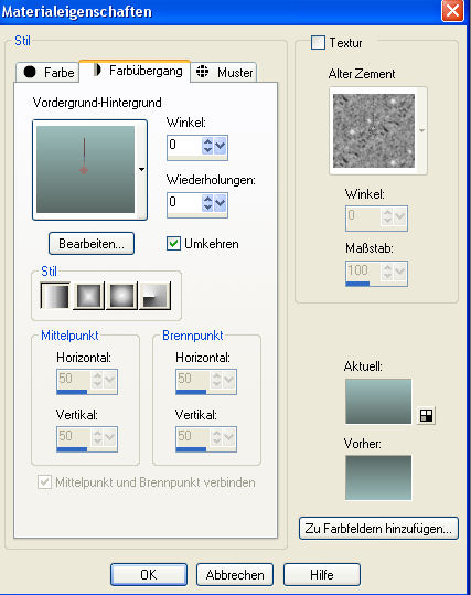 2. Such Dir aus Deiner Frauentube eine helle Vordergrundfarbe (meine ist #9cbebc) und eine dunklere Hintergrundfarbe (meine ist #596965) und erstelle Dir aus diesen Farben einen Farbverlauf, wie im Screen zu sehen.