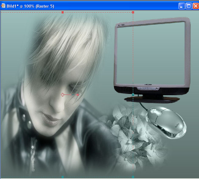 6. Aktiviere die Ebene Raster 1 (mit linker Maustaste im Ebenenmanager anklicken) und öffne nun Dein Tube "KaraT3304.psp", Bearbeiten - Kopieren und fürge es als neue Ebene auf Deinem Arbeitsblatt ein. Bild - Größe ändern - 60% (Größe aller Ebenen anpassen nicht angehakt), stelle den Mischmodus im Ebenenmanager auf Helligkeit (Legacy) und verschiebe das Tube links unten neben die Maus.