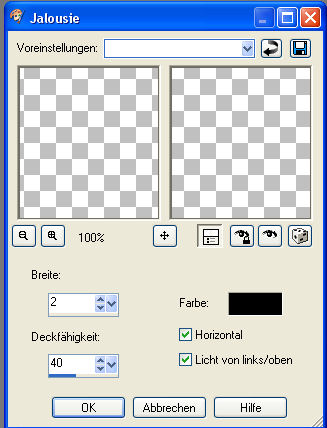 12. Klickt mit dem Zauberstab in Euren Rand, Effekte - Textureffekte - Jalousie mit den Werten vom Screen: