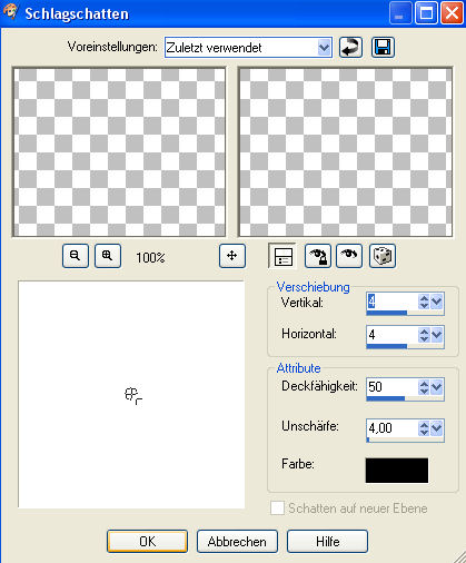 14. Gleicher Schlagschatten noch einmal, jedoch bei Vertikal und Horizontal jeweils -4 eingeben. Auswahl aufheben.