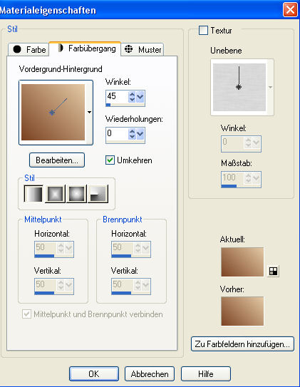 Dieses Tutorial unterliegt meinem Copyright. Es ist mit Paint Shop Pro 9 geschrieben, kann aber auch mit jeder anderen Version nachgebastelt werden. Ihr benötigt Paint Shop Pro Animationsshop die Filter: Filters Unlimited - Paper Textures Xero Porcelain Graphics Plus - Cross Shadow Tuben: 2 Hintergrundbilder oder -tuben 1 Kindertube 1 Frauentube Dekorationsmaterial evtl. die Maske 20-20 (wenn Du als Hintergründe Bilder verwendest) Mein Material kannst Du Dir hier herunterladen. Wenn Du alles zusammen hast, dann laß uns beginnen: 1. Öffne ein neues transparentes Arbeitsblatt in 700 x 600 Pixel. 2. Suche Dir aus Deinen Tuben eine hellere Vordergrundfarbe (meine ist #E4CAA6) und eine dunklere Hintergrundfarbe (meine ist #7B4221) und erstelle Dir daraus folgenden Farbverlauf: