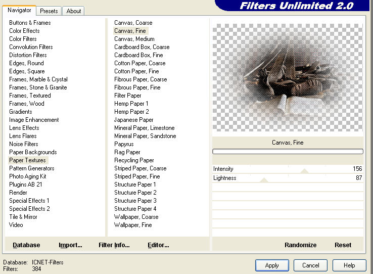 3. Fülle Dein Arbeitsblatt mit dem Farbverlauf. 4. Öffne Dir nun das Bild "misc.jpg" und wende auf diesem Bild einmal die Maske 20-20 an. Ebenen - Einbinden - Gruppe zusammenfassen (wenn Du statt einem Bild eine Tube verwendest, dann brauchst Du die Maske nicht anzuwenden) Bearbeiten - Kopieren und füge die Gruppe auf Deinem Arbeitsblatt als neue Ebene ein. 5. Fasse nun die beiden Ebenen sichtbar zusammen und wende den Filter Unlimited 2.0 - Paper Textures wie folgt an: