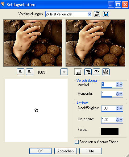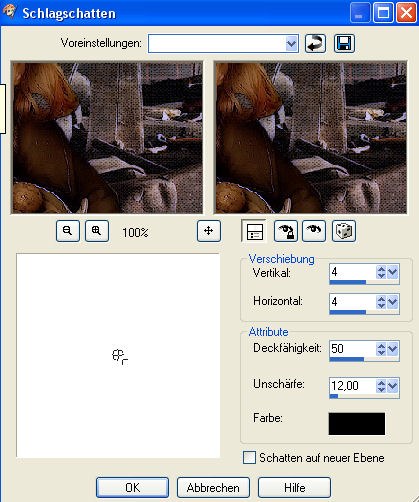 6. Kopiere nun das Tube "mc2694.pspimage" und füge es als neue Ebene auf Deinem Bild ein und gehe auf Bild - Größe ändern - 80% (Größe aller Ebenen anpassen nicht angehakt). Verschiebe die Tube an den linken unteren Rand. Schärfe über Anpassen - Schärfe - Scharfzeichnen einmal nach und dupliziere die Ebene. Fasse die Ebene nach unten zusammen und wende folgenden Schlagschatten an:
