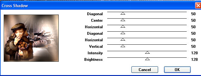 8. Auswahl - Alles auswählen - Ändern - Verkleinern - um 3 Pixel. Auswahl - Umkehren und füll diese Auswahl mit Deiner hellen Vordergrundfarbe. Lass die Auswahl bestehen und wende den Filter Graphics Plus - Cross Shadow mit folgender Einstellung an:
