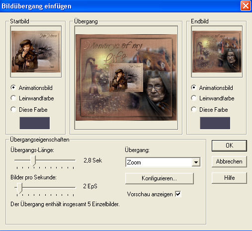 20. Hebe die Auswahl auf und dupliziere Deine Hintergrundebene. Bleibe auf der duplizierten Ebene und gehe auf Bild - Größe ändern - 90% (Größe aller Ebenen anpassen nicht angehakt). Wende auf der verkleinerten Ebene den Schalgschatten aus Schritt 9 an.... auch einmal mit den Minuswerten. 21. Beschrifte Dein Bild wie Du magst oder wende schöne Brushes an und vergesse auch auf diesem Bild Dein Wasserzeichen nicht. 22. Ebenen - Einbinden - Alle zusammenfassen. 22. Kopiere nun Dein erstes Bild, welches Du erstellt hast und füge es im Animationsshop als neue Animation ein. 23. Gehe zurück zu PSP und kopiere Dein zweites Bild und füge es im Anishop ein über Bearbeiten - Einfügen - Nach dem aktuell ausgewählten Einzelbild. 24. Klicke einmal in den Rand Deines ersten Animationsbildes, so dass es markiert ist und gehe nun auf Effekte - Bildübergang einfügen und füge den Effekt Zoom wie folgt ein: