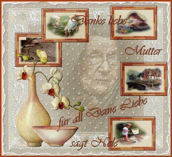 15. Legt eine neue Rasterebene an - Auswahl - Alles auswählen. Füllt diese Auswahl mit Eurer Hintergrundfarbe. Auswahl - Ändern - Verkleinern - um 5 Pixel und drückt einmal die Entf-Taste auf Eurer Tastatur. Hebt die Auswahl auf. 16. Beschriftet Euer Bild nun noch und vergesst nicht Euren Namenszug oder Wasserzeichen. 17. Ebenen - Einbinden - Alle zusammenfassen. Speichert Euer Bild als jpg-Datei ab und fertig ist Euer MUTTERTAGSGRUSS! Ich hoffe, es hat Euch Spaß gemacht dieses Tutorial nachzubasteln und Ihr schaut bald wieder auf meiner Seite vorbei.
