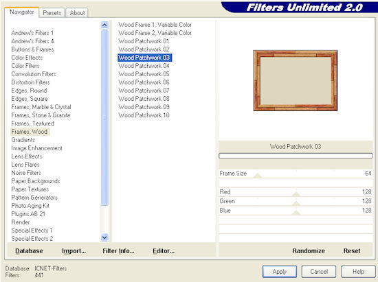 und füllt die Auswahl mit Eurer Vordergrundfarbe. Laßt die Auswahl noch bestehen. 7. Wendet auf der Auswahlebene den Filter Filters Unlimited 2.0 - Frames, Wood - Patchwork 03 mit diesen Einstellungen an: