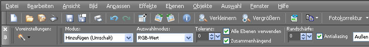 Hebt die Auswahl nun auf. 8. Dupliziert diese Ebene 4 mal und verschiebt die einzelnen duplizierten Ebenen an Plätze Eurer Wahl. Die Bilder dürfen auch gern etwas überlappen. Benennt die Bilderebenen um in Bild1 Bild2 Bild3 Bild4 Bild5 9. Geht auf die Ebene Bild1. Markiert Euch nun mit dem Zauberstab mit diesen Einstellungen: