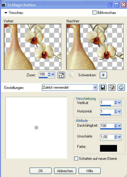 den inneren Bereich der Ebene Bild1. Legt eine neue Rasterebene an und kopiert das Tube "3rdwheel-lombardo.pspimage" oder Eure eigene Kindertube und fügt sie in eine Auswahl ein. Hebt die Auswahl auf und geht auf Ebenen - Einbinden - Nach unten zusammen. 10. Aktiviert nun die Ebene Bild2 und markiert Euch auch dort mit dem Zauberstab, Legt wieder eine neue Rasterebene an und kopiert das Tube"SS_2012.pspimage" oder Eure eigene Landschaftstube und fügt sie in eine Auswahl ein. Hebt die Auswahl auf und geht wieder auf Ebenen - Einbinden - Nach unten zusammenfassen. 11. Aktiviert Eure Ebene Bild3 und markiert das Innere mit dem Zauberstab. Ebenen - Neue Rasterebene und kopiert das Tube "colorsofspring.pspimage" oder Eure eigene Kindertube und fügt sie in eine Auswahl ein. Hebt die Auswahl auf und geht wieder auf Ebenen - Einbinden - Nach unten zusammenfassen. 12. Aktiviert die Ebene Bild4, markiert mit dem Zauberstab, legt eine neue Rastereben an und kopiert das Tube "crysatlscreek.pspimage" oder Eure dritte eigene Kindertube und fügt sie in eine Auswahl ein. Hebt die Auswahl auf und geht auf Ebenen - Einbinden - Nach unten zusammenfassen. 13. Aktiviert die Ebene Bild5, markiert mit dem Zauberstab, legt eine neue Rasterebene an. Kopiert das Tube "AH_Brief_2704_08.pspimage" oder Eure eigene Brief- oder Decotube und fügt sie in eine Auswahl ein. Hebt die Auswahl auf und geht wieder auf Ebenen - Einbinden - Nach unten zusammenfassen. 14. Geht nun auf Eure oberste Ebene, kopiert das Tube "Mtm-tagstuff 15- Orchid-Comp-10 maart 2007.pspimage" oder Eure eigene Blumentube und fügt sie als neue Ebene auf Eurem Bild ein. Verschiebt sie nach links unten. Gebt der Blumentube diesen Schlagschatten: