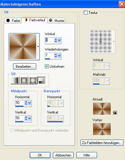 Dieses Tutorial habe ich selbst entworfen und es unterliegt meinem Copyright. Das Material stammt aus Tauschgruppen und das Copyright liegt beim jeweiligen Künstler. Ich habe das Tutorial mit Paint Shop Pro X2 geschrieben, es läßt sich aber mit allen anderen PSP-Versionen problemlos nachbasteln. Du benötigst: Paint Shop Pro Animationsshop Tuben: 1 Frauentube 1 Fotorahmentube 1 Buchtube 3 verschiedene Tuben für die Auswahlen (Blumen. Landschaften, Deco o.ä.) Mein Material kannst Du Dir hier herunterladen. Filter: Filters Unlimited 2.0 - Special Effects 1 - Aged Film Hast Du alles zusammen? Dann lass und beginnen! 1. Öffne Dir ein neues transparentes Arbeitsblatt in 600 x 550 Pixeln Größe. 2. Such Dir aus Deinen Tuben eine helle Vordergrundfarbe (meine ist #c3c36b) und eine dunkle Hintergrundfarbe (meine ist #505646). Erstelle Dir aus diesen Farben einen schönen Farbverlauf. Ich habe diesen gewählt: