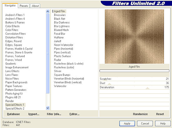 Fülle Dein Blatt damit. 3. Anpassen - Bildschärfe verringern - Gaußscher Weichzeichner - Radius 15. 4. Wende auf dieser Ebene den Filter Filters Unlimited 2.0 - Special Effects 1 - Aged Film mit folgenden Einstellungen an: