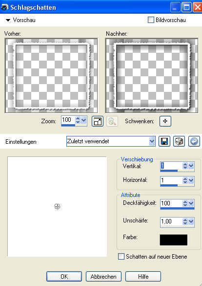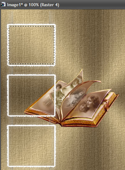 5.Kopiere das Tube " opened_book-by-maleschka.pspimage" oder Dein eigenes Buchtube und füge es auf Deinem Bild als neue Ebene ein. 6. Kopiere das Tube " photo16.pspimage" oder Deine eigene Fototube und füge sie auf Deinem Bild als neue Ebene ein. Verschiebe sie nach links an den Rand. Wende folgenden Schlagschatten an: