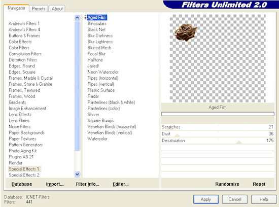 Lege eine neue Rasterebene an und kopiere das Tube " Image5Sepia Rose_LR.pspimage" oder Deine eigene Blumentube und füge sie in eine Auswahl ein. Hebe die Auswahl auf. 8. Jetzt ziehst Du wieder eine rechteckige Auswahl in Deinem mittleren Foto auf. Achte darauf, dass Du auf der Fototubenebene bist. Lege eine neue Rasterebene an und kopiere das Tube "by_stirner_oldtimes.pspimage" oder Deine eigene Vogeltube und füge sie in eine Auswahl ein. Hebe die Auswahl auf. 9. Zieh nun eine rechteckige Auswahl in dem unteren Foto auf (auch hier wieder darauf achten, dass Du die Fototube aktiviert hast), lege auch hier wieder eine neue Rastereben an und kopiere das Tube " whmhumphries summertimehues_colorel.png" oder Deine eigene Blumentube und füge sie in eine Auswahl ein. Hebe die Auswahl auf. 10. Wende den Filter Filters Unlimited 2.0 - Special Effekts 1 - Aged Film mit folgenden Einstellungen auf Deine 3 Tuben an, die Du in die Auswahlen eingefügt hast: