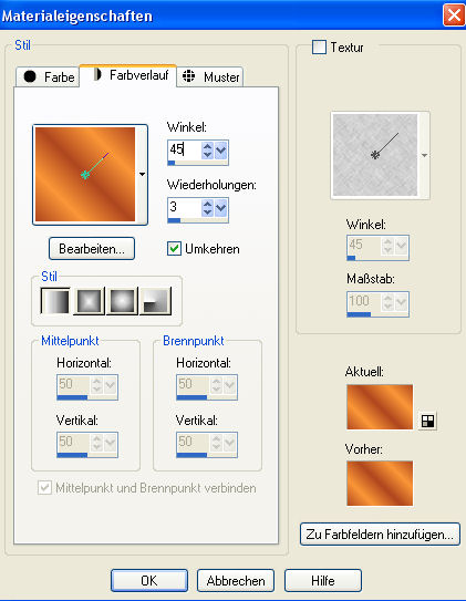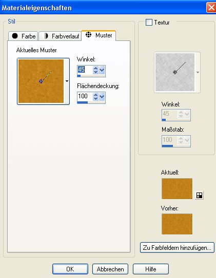 Dieses Tutorial habe ich selbst geschrieben und es unterliegt meinem Copyright. Das Material stammt aus Tauschgruppen und das Copyright liegt beim entsprechenden Künstler. Das Tutorial wurde mit Paint Shop Pro X2 geschrieben, läßt sich aber problemlos mit allen anderen Versionen nachbasteln. Du benötigst: Paint Shop Pro Animationsshop Tuben: 1 Gesichtstube 1 Blumentube 1 Vogeltube 1 Schmetterlingstube 1 Textur evtl. ein Blink Mein Material kannst Du Dir hier herunterladen. Filter: Toadies - Weaver Hast Du alles zusammen? Dann lass uns beginnen! 1. Öffne Dir ein neues transparentes Arbeitsblatt in der Größe 550 x 550 und suche Dir aus Deinen Tuben eine schöne Vordergrundfarbe (meine ist #fa9638) und eine dunklere Hintergrundfarbe (meine ist #ae461f). 2. Fülle Dein Arbeitsblatt mit der Vordergrundfarbe. 3. Öffne die Textur "orang122.gif" oder Deine eigene Textur im PSP und minimiere sie. 4. Lege Dir eine neue Rasterebene an und suche Dir als Muster nun Deine Textur mit folgenden Einstellungen: