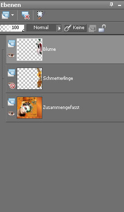 und schärfe einmal nach. Mache es unsichtbar indem Du im Ebenenmanager auf das Auge neben der Ebene klickst. 18. Kopiere nun das Tube "@nn_100407_photos_F&F_Aristolochia_tdstudio.psp" oder Deine eigene Blumentube und ziehe diese auch so mit dem Objektverschiebewerkzeug, dass sie ebenfalls genau auf den rechten Rand passt. 19. Benenne die Ebenen nun um in Schmetterlinge und Blume. Nun müsste es in Deinem Ebenenmanager so aussehen: