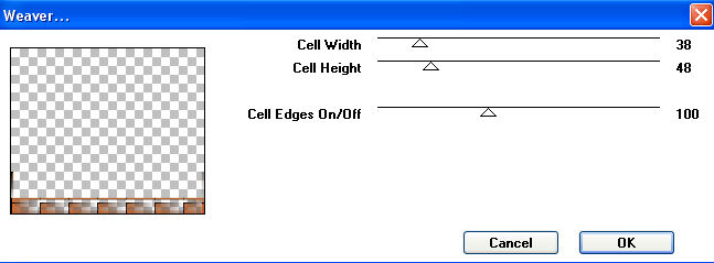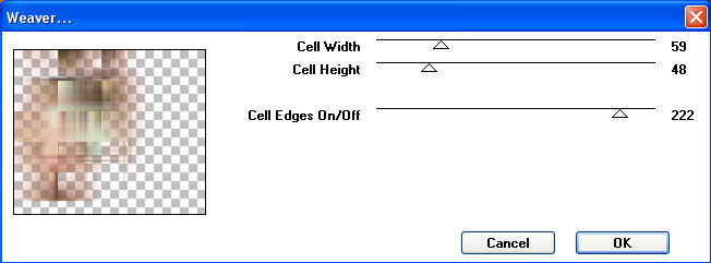 12. Kopiere das Tube "Birds42_dédé.psp" oder Dein eigenes Vogeltube und füge es als neue Ebene auf Deinem Bild ein. Wenn Du die beigelegte Tube verwendest, dann ändere die Größe auf 50% (Größe aller Ebenen anpassen nicht angehakt). Setze sie nach rechts oben auf die zusammengefasste Ebene. 13. Kopiere nun das Tube "@nn_040707_face_112_Kryan2_tdstudio_small.pspimage" oder Deine eigene Gesichtstube und füge sie als neue Ebene auf Deinem Bild ein. Wenn Du die beigelegte Tube verwendest, dann kannst Du die Größe so belassen. Setze sie im Ebenenmanager auf den Mischmodus Hartes Licht. Schiebe sie im Ebenenmanager unter die Vogelebene. 14. Bleibe auf der Ebene mit dem Gesicht und wende dort den Filter Toadies - Weaver mit diesen Einstellungen an: