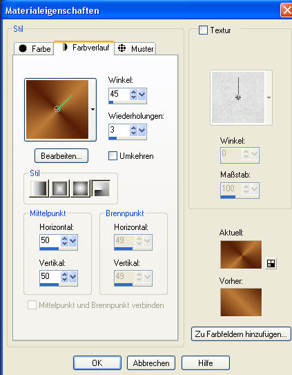 Dieses Tutorial habe ich selbst entworfen und es unterliegt meinem Copyright. Das Material stammt aus Tauschgruppen und das Copyright liegt beim jeweiligen Künstler. Ausserdem habe Tuben von Git und Johanna benutzt und von beiden habe ich die Erlaubnis dazu. Vielen Dank an Git und Johanna! Ich habe das Tutorial mit Paint Shop Pro X2 geschrieben, es läßt sich aber mit allen anderen PSP-Versionen problemlos nachbasteln. Du benötigst: Paint Shop Pro Animationsshop Tuben: 1 Textur oder ein Hintergrundbild 1 Gesichtstube 1 Kettentube 1 Türtube 1 Blumentube Mein Material kannst Du Dir hier herunterladen. Filter: FM Tile Tool - Blend Emboss anishopeigene Effekte Hast Du alles zusammen? Dann lass uns beginnen! 1. Öffne Dir ein neues transparentes Arbeitsblatt in 700 x 500 Pixeln Größe. 2. Suche Dir aus Deinen Tuben eine hellere Vordergrundfarbe (meine ist #bc7b37) und eine dunkle Hintergrundfarbe (meine ist #561e07). Erstelle Dir aus diesen beiden Farben einen schönen Farbverlauf. Ich habe mich für diesen entschieden: