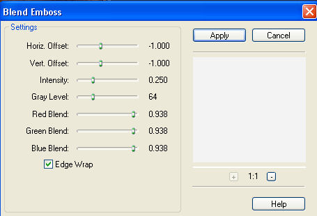 Fülle Dein Blatt damit. Anpassen - Bildschärfe verringern - Gaußscher Weichzeichner und gib dort den Wert 25 ein. 3. Lege eine neue Rasterebene an. Auswahl - Alles auswählen Kopiere Dir die Textur "Texture_38_by_ro_stock.jpg" oder Deine eigene und füge sie in eine Auswahl ein. Hebe die Auswahl auf. Setze den Mischmodus dieser Ebene im Ebenenmanager auf "Weiches Licht". Du kannst hier natürlich wieder etwas spielen, denn der Mischmodus ist abhängig von Deinen Tuben. 4. Kopiere das Tube "aclis_house_21_08_2008.pspimage" oder Deine eigene Türtube und füge sie als neue Ebene auf Deinem Bild ein. Verschiebe sie nach rechts an den Rand und setze die Deckfähigkeit im Ebenenmanager auf 35% herunter. 5. Kopiere das Tube "Mist_Face_Dreamy_DragonBlu0808.pspimage" oder Deine eigene Gesichtstube und füge sie auf Deinem Bild als neue Ebene ein. Passe sie größenmäßig an. Ich habe die Tube auf 80% verkleinert (Größe aller Ebenen anpassen nicht angehakt) und habe sie Vertikal gespiegelt. Verschiebe sie nach links an den Rand. 6. Kopiere das Tube "22_10_2006_gothic01_git.pspimage" oder Deine eigene Kettentube und füge sie als neue Ebene auf Deinem Bild ein. Ich habe sie direkt mittig über die Tür gesetzt. 7. Kopiere das Tube "JHanna_09c.pspimage" oder Dein eigenes Blumentube und füge es als neue Ebene auf Deinem Bild ein. Passe das Tube größenmäßig an. Ich habe die Tube auf 70% verkleinert (Größe aller Ebenen anpassen nicht angehakt). Stelle den Mischmodus im Ebenenmanager auf "Weiches Licht" und verschiebe die Tube nach rechts oben in die Ecke. 8. Lege eine neue Rasterebene an. Auswahl - Alles auswählen Fülle die Auswahl mit Deinem Farbverlauf (dazu muss der Auswahlmodus Deines Farbeimers auf "Deckende Bereiche" stehen). Auswahl - Verkleinern - um 6 Pixel Drücke einmal die Entf-Taste auf Deiner Tastatur. Auswahl - Umkehren 9. Wende den Filter FM Tile Tools - Blend Emboss mit diesen Einstellungen an: