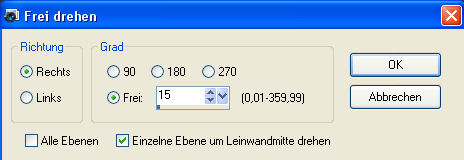 Wende den Schlagschatten noch einmal an mit Minuswerten bei Vertikal und Horizontal. Hebe die Auswahl auf. 10. Setze jetzt auf oberster Ebene Dein Wasserzeichen oder Deinen Namenszug. 11. Nun schreibe Deinen Schriftzug auf Dein Bild. Ich habe dazu meinen Farbverlauf audgewählt (das Häkchen bei Umkehren habe ich herausgenommen). Mein Schriftzug lautet "Outbreak". Benenne die Ebene um in "Schrift1". 12. Ebenen - Einbinden - Sichtbare zusammenfassen. Bearbeiten - Kopieren 13. Im Animationsshop Einfügen - Als neue Animation. 14. Zurück zu PSP und mache den letzten Schritt rückgängig. Dupliziere nun Deine Ebene "Schrift1". Benenne die duplizierte Ebene um in "Schrift2". Mache die Ebene "Schrift2" unsichtbar indem Du im Ebenenmanager auf das Auge vor der Ebene klickst. Aktiviere die Ebene "Schrift1" und radiere dort den zweiten Teil Deines Schriftzuges weg. In meinem Fall war das "break". 15. Jetzt mache die Ebene "Schrift2" wieder sichtbar... klicke dazu noch einmal auf das Auge. Mache die Ebene "Schrift1" unsichtbar. Aktiviere Deine Ebene "Schrift2". Radiere nun den ersten Teil Deines Schriftzuges weg. In meinem Fall war das "Out". Bild - Frei drehen - mit diesen Einstellungen: