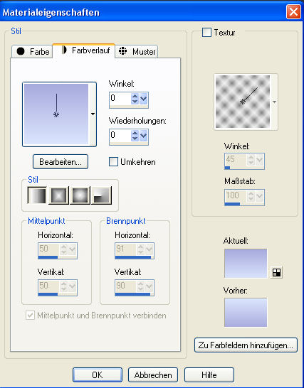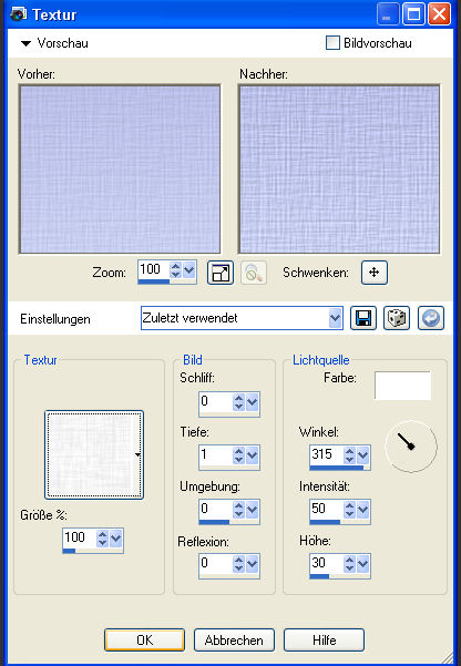 2. Öffnet eine neue transparente Arbeitsfläche in 600 x 550 Pixel Größe und füllt sie mit Eurem Farbverlauf. 3. Geht auf Effekte - Textureffekte - Textur und sucht Euch eine schöne Textur. Ich habe diese genommen mit folgenden Einstellungen: