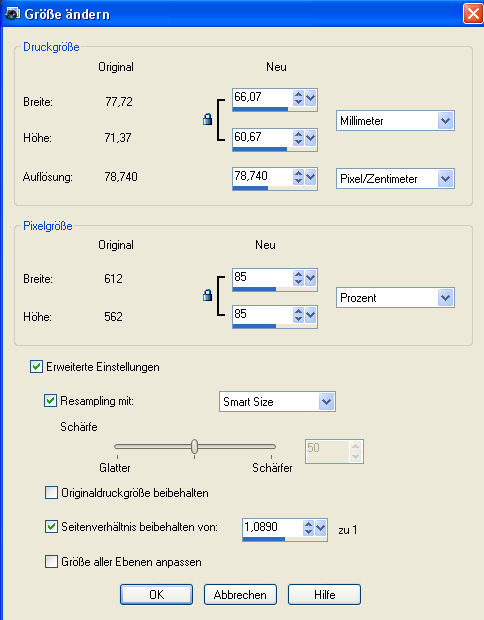 4. Öffnet Eure Frauen- oder Gesichtstube, kopiert sie und fügt sie als neue Ebene in Euer Bild ein.Schiebt sie an den linken Rand. Vergrößert oder verkleinert sie entsprechend falls sie nicht passt. 5. Fügt nun einen symmetrischen Rand von 2 Pixeln in Eurer dunkleren Hintergrundfarbe hinzu. Dann 2 Pixel symmetrischer Rand in der helleren Vordergrundfarbe und nochmal 2 Pixel symmetrisch in der Hintergrundfarbe. 6. Macht nun einen Rechtsklick in die Ebenenpalette auf Eure Hintergrundebene und wandelt die Hintergrundebene um. 7. Dupliziert die Ebene und bleibt auf der obersten Ebene. Bild - Größe ändern - 85% (Größe aller Ebenen nicht angehakt):