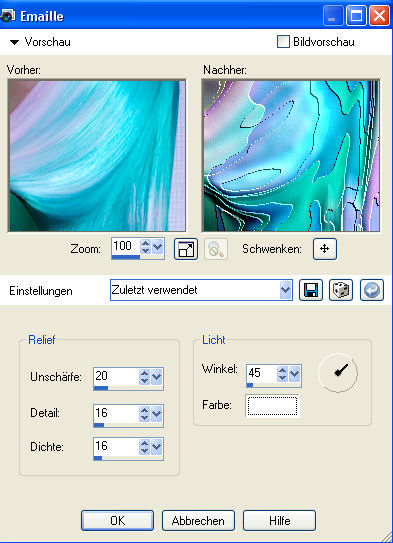 8. Geht auf die untere Ebenen und dort auf Effekte - Kunsteffekte - Emaile mit folgenden Einstellungen: