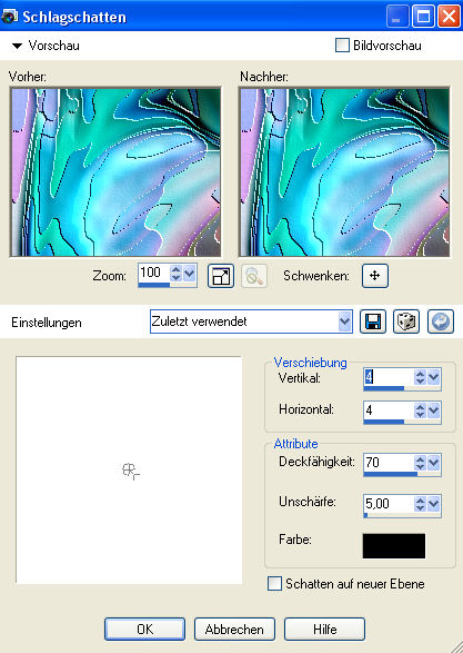 9. Spiegelt die Ebene einmal horizontal und einmal vertikal. 10. Geht auf die oberste Ebene und fügt diesen Schlagschatten hinzu: