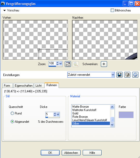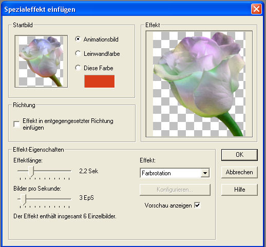 Form, Eigenschaften, Licht belasst Ihr auf den Standarteinstellungen und bei Rahmen ändert Ihr die Farbe auf Eure dunklere Hintergrundfarbe. 13. Ändert die Größe dieser Ebene auf 70% (Größe aller Ebenen anpassen nicht angehakt). 14. Kopiert diese Ebene und fügt sie im Animationsshop als neue Animation ein und minimiert sie Euch dort erstmal. 15. Geht zurück zu PSP und löscht dort diese Ebene mit dem Vergrößerungsglas. Kopiert nun Euer zusammengefasstes Bild und fügt auch das im Anishop als neue Animation ein. 16. Öffnet im Animationsshop Euer Blumentube und geht auf Effekte - Spezialeffekt einfügen und wählt Euch dort diese Einstellungen:
