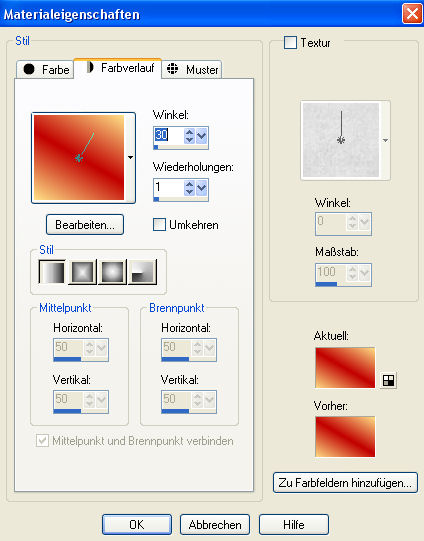 Dieses Tutorial wurde von mir selbst entworfen und unterliegt meinem Copyright. Das Material stammt aus Tauschgruppen und unterliegt dem Copyright des jeweiligen Künstlers. Das Tutorial wurde mit Paint Shop Pro X2 geschrieben, läßt sich aber auch mit jeder anderen Version problemlos nachbasteln. Ihr benötigt Paint Shop Pro Tuben: 1 Blumentube 1 Form Meine Form ist von Elisabth - Danke Elisabeth! Legt Euch die Form in Euren Formenodner von PSP bevor Ihr PSP öffnet. Filter: Filter Factorys Gallery G - Blast `Em Graphics Plus - Cross Shadow Filters Unlimited Tile & Mirror - Mirrored & Scaled Mein Material könnt Ihr Euch hier herunterladen. Habt Ihr alles zusammen?.... Dann laßt uns beginnen! 1. Öffnet Euch ein neues transparentes Arbeitsblatt in 700 x 400 Pixel Größe. 2. Sucht Euch aus Euren Tuben eine helle Vordergrundfarbe (meine ist #fee187) und eine dunklere Hintergrundfarbe (meine ist #c10000). 3. Erstellt Euch aus Eurer Vorder- und Hintergrundfarbe folgenden Farbverlauf: