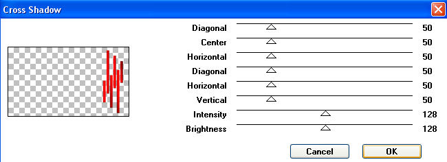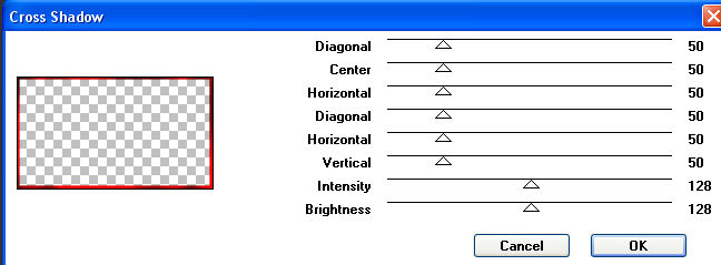 Fügt Euer Blumentube noch einmal in diese Auswahl ein. Hebt die Auswahl auf und spiegelt einmal Vertikal. 8. Dupliziert diese Ebene und spiegelt sie wieder Vertikal. Verschiebt die Ebene wie im Vorschaubild zu sehen.Fasst diese beiden Ebenen nach unten zusammen und wendet den Schlagschatten aus Punkt 5 an. Fasst alle Ebenen sichtbar zusammen. 9. Legt Euch eine neue Rasterebene an und geht auf Auswahl - Alles auswählen - Ändern - Verkleinern - um 5 Pixel - Auswahl Umkehren und füllt die Auswahl mit Eurer Hintergrundfarbe. Wendet den Filter Graphics Plus - Cross Shadow mit folgenden Einstellungen an: