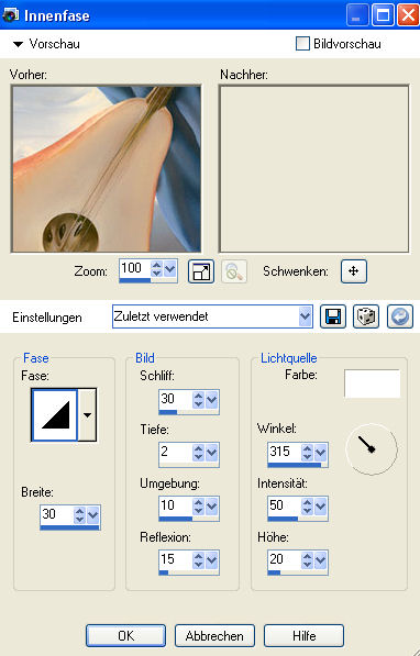 Dieses Tutorial ist von mir entworfen und unterliegt meinem Copyright. Das Material stammt aus Tauschgruppen und unterliegt dem Copyright des jeweiligen Künstlers. Ich habe das Tutorial mit Paint Shop Pro X2 geschrieben, es läßt sich aber auch mit allen anderen Versionen Problemlos nachbasteln. Du benötigst Paint Shop Pro Material: 1 Hintergrundbild evtl. Corner oder Decomaterial Filter: 2manekena - MezzoForce-Ice - den kannst Du Dir hier herunterladen. Graphics Plus - Cross Shadow Filters Unlimited 2 - Tile & Mirror - Seamless Blend (horizontal) Hast Du alles zusammen? Dann laß uns beginnen! 1. Öffne Dir in PSP Dein Bild. Mache Dir mit Shift+D eine Kopie davon und minimiert das Original, denn wir brauchen es später noch. Die Größe sollte eine Kantenlänge von 500 Pixeln nicht überschreiten. Wenn nötig verkleinere Dein Bild auf dieses Maß. 2. Suche Dir aus Deinem Bild zwei schöne Farben für Vordergrund (meine ist #cbd0d4) und Hintergrund (meine ist #7089a8). Notiert Euch die Farbcodes.... wir brauchen sie später noch. 3. Bild - Rand hinzufügen - 2 Pixel in Deiner Vordergrundfarbee. 4. Bild - Rand hinzufügen - 3 Pixel in Deiner Hintergrundfarbe. Markiere den Rand mit Deinem Zauberstab und gehe auf Effekte - 3D-Effekte - Innenfase mit folgenden Einstellungen: