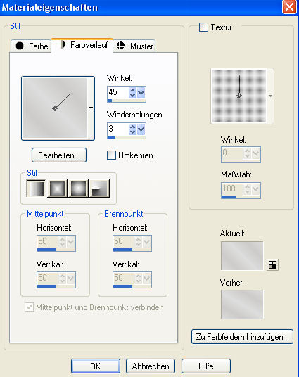 Hebe die Auswahl auf. 5. Bild - Rand hinzufügen - 2 Pixel in der Vordergrundfarbe. 6. Stell Deine Vordergrundfarbe um auf eine sehr helle Farbe aus Deinem Bild (meine ist #dddddd) und Deine Hintergrundfarbe stellst Du auch auf eine hellere Farbe um (meine ist #cccbc9). Erstelle Dir aus diesen Farben einen Farbverlauf. Ich habe diesen gewählt: